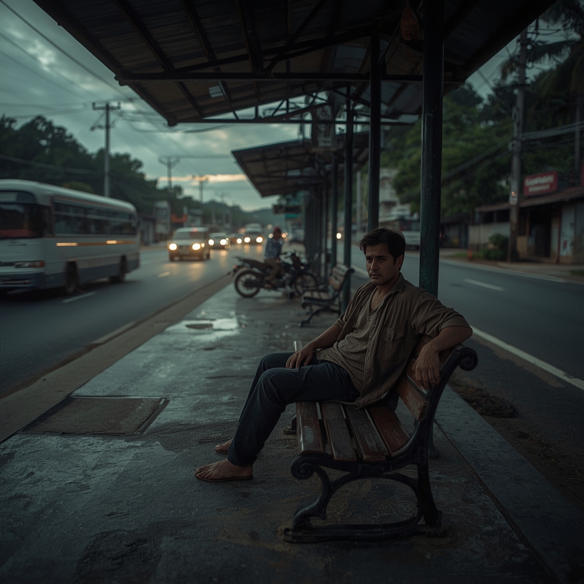 Slightly humbled, I course-corrected, heading for the main artery, Thep Krasattri Road—a wide, roaring river of traffic that, logically, led straight to the bus terminal. There, I found a large, covered bus stop. A good sign. Under its shade sat just two souls: a young Thai man waiting patiently for a bus, and a motorcycle taxi driver, lounging on his bike with the stillness of a silent predator.