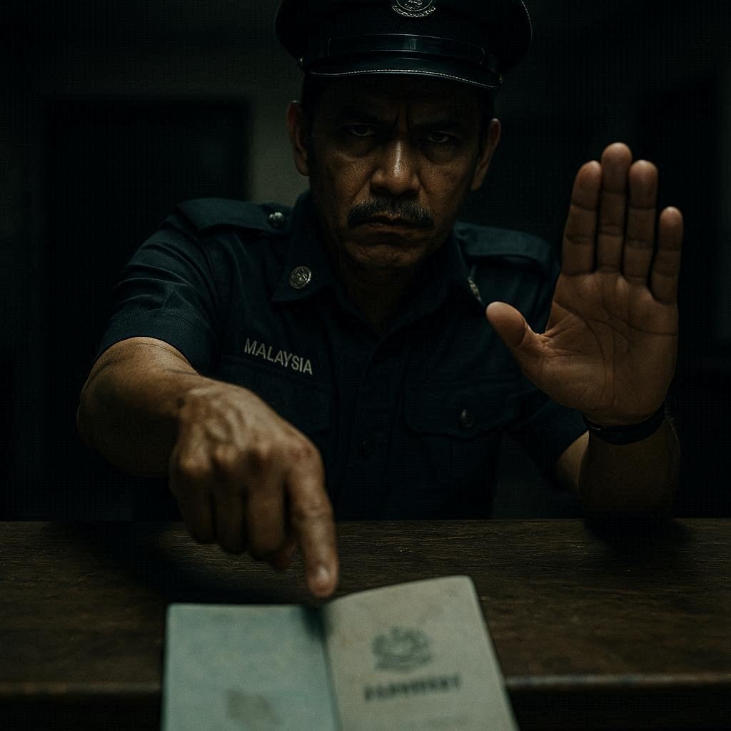The Malaysian immigration post at Pengkalan Kubor was a place that seemed to exist outside of officialdom. From the river, it looked like two dark, unassuming windows in a plain building, utterly devoid of any sign identifying it as a border crossing. To the left, a faded notice above a window mentioned the Kementerian Kesihatan (Ministry of Health)—a relic from the pandemic era, now clearly abandoned. To the right, a window with no sign at all. Yet, a queue of locals, all Malaysians, had already formed there with an instinctual knowledge we lacked. We were the only foreigners in sight. With a shrug, we joined the back of the line, following the locals’ lead into the darkness. When my turn came, the female officer behind the counter took my passport, and her friendly demeanor vanished. She examined it like a forensic scientist studying a crime scene. She called her boss over.