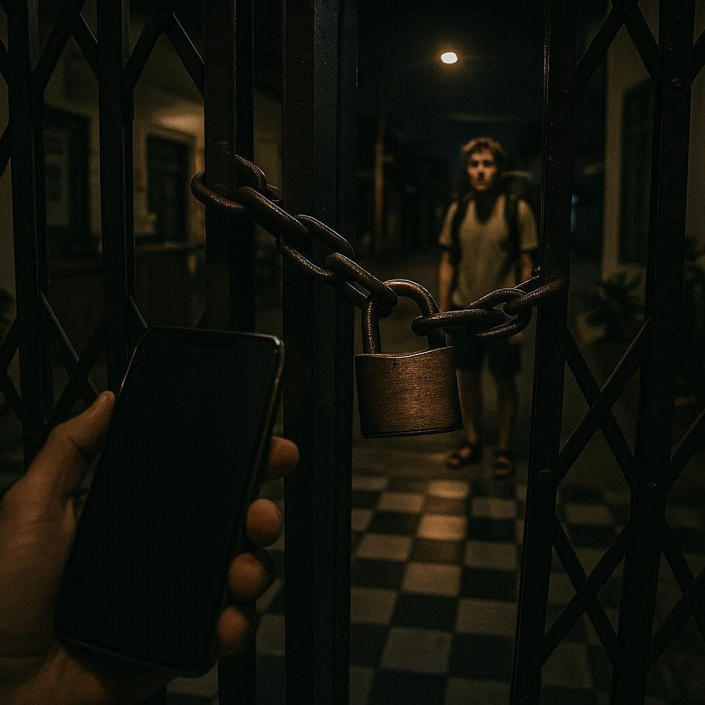 Minutes later, a young Western backpacker appeared on the other side of the gate, looking confused. A guest, locked out. I’ve been in this movie before—the late-night writer in the common room, unwittingly becoming the last line of defense against a hostel’s opaque policies. One by one, the night owls return, and I, the accidental gatekeeper, am their only hope.